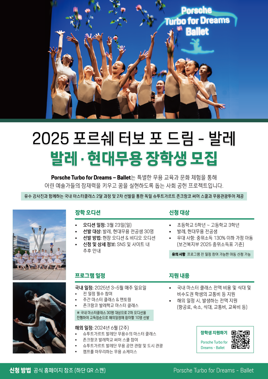 포르쉐코리아(대표 마티아스 부세)가 초록우산(회장 황영기), 댄스플래너(대표 김동욱)와 함께 재능 있는 무용 전공 학생들에게 해외 연수 기회를 제공하는 ‘포르쉐 터보 포 드림-발레’ 프로젝트를 진행한다.